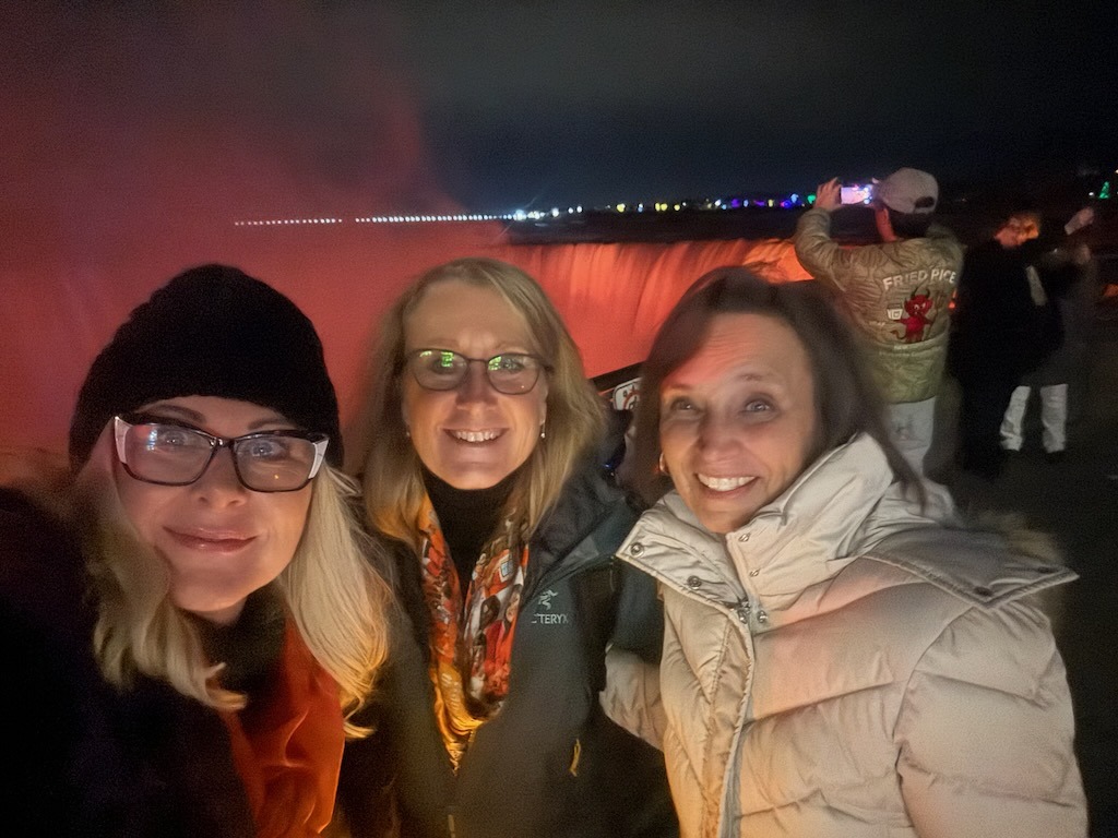 Club members gather at the lighting of Niagara Falls, ON, in orange for the launch of the 16 Days of Activism and evening vigil. Samantha McAuley, Sheena Poole & Nancy Peacock (L-R)